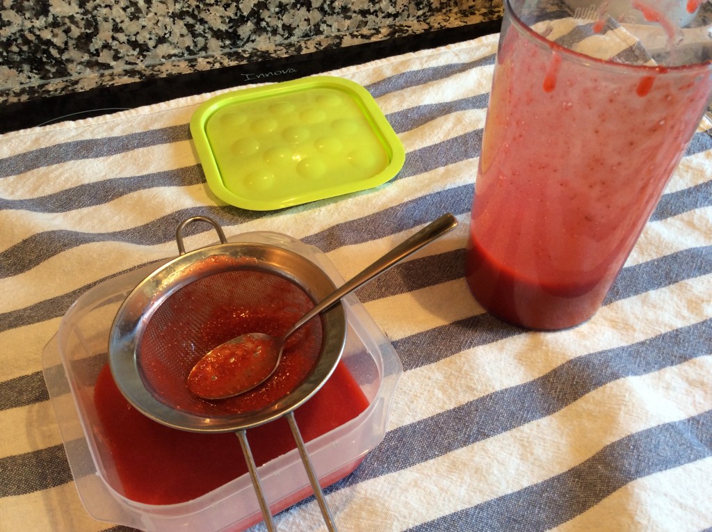2. Pasamos por un colador el puré de fresas para quitarle las semillas y reservamos en la nevera