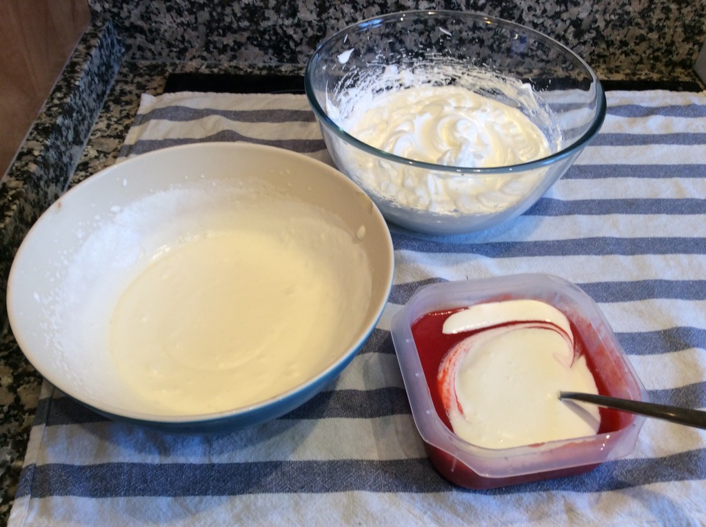 6. Esta mezcla la incorporamos al recipiente donde tenemos la nata semi montada y seguimos mezclando bien