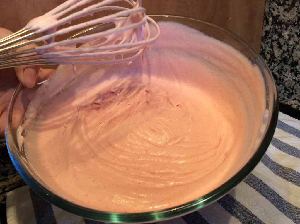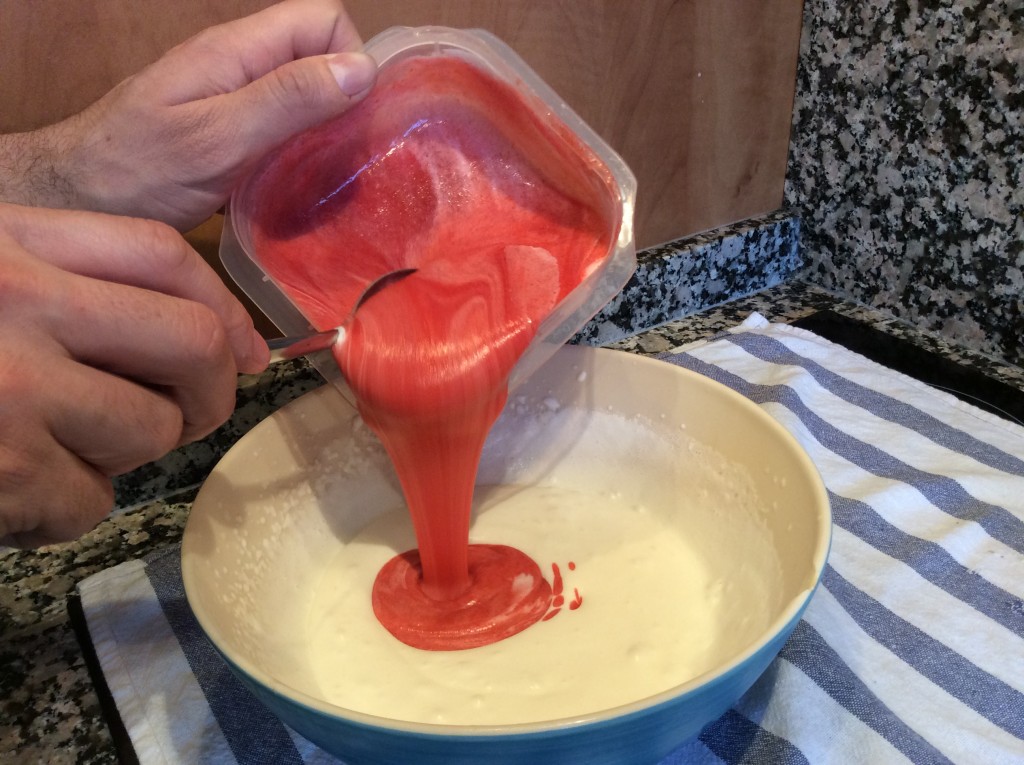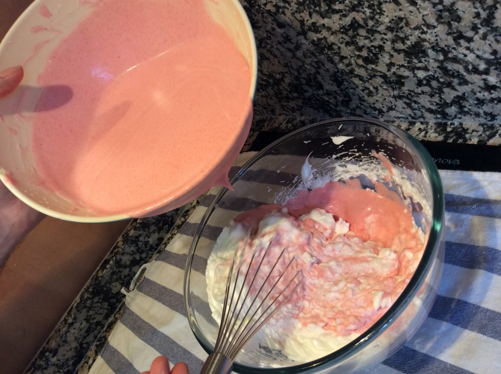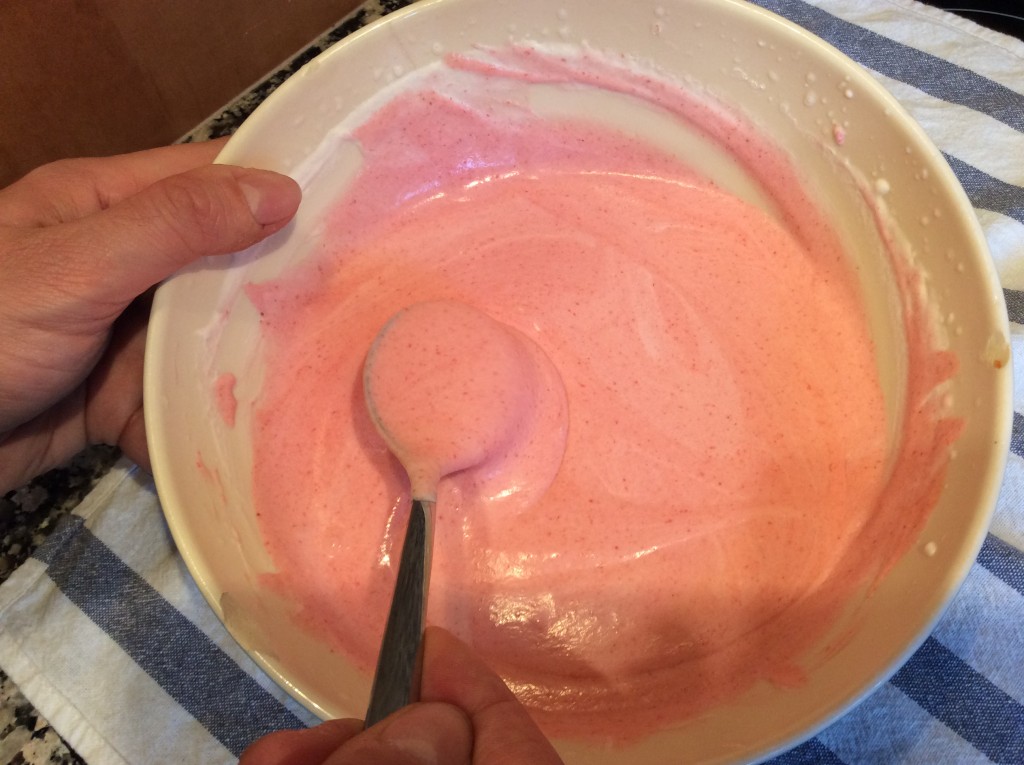 5. Ahora se añade un poco de nata al puré de fresas y mezclamos con movimientos envolventes