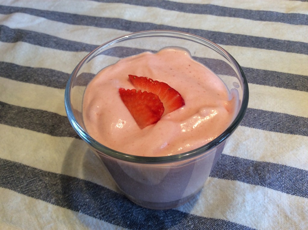 9. Servimos en unos vasos o copas y decoramos al gusto……….con fresas  😉